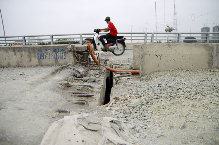 | Những chiếc ô tô qua lại trên cầu phải lựa rất khéo mới có thể qua được các đoạn khe hở và vấp. |