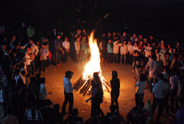 | Mọi người cầm tay nhau hát múa quanh đống lửa |