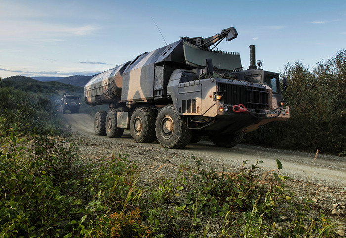 | Xe chở tên lửa chiến thuật cơ động trên đường băng rừng |