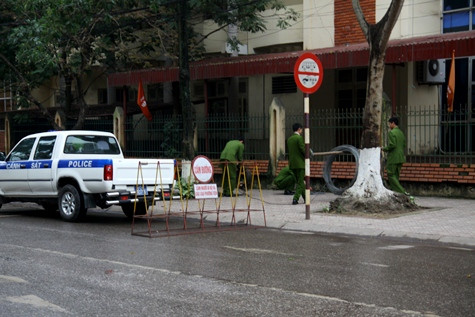 | Lực lượng công an đã dựng hàng rào chắn đường khu vực vào trụ sở TAND tỉnh Bắc Giang. |