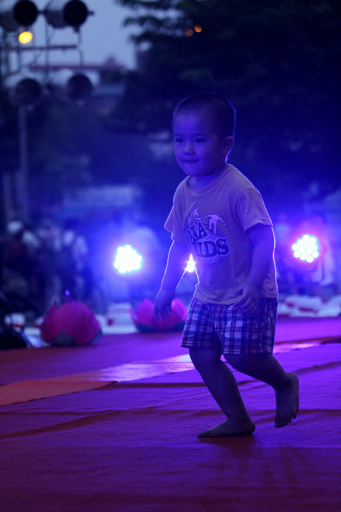| Tại các quận, huyện ở Hà Nội những ngày này thường dựng các sân khấu ngoài trời để tổ chức Tết trung thu các các cháu, trong ảnh là một bé gái nô đùa trước ánh đèn điện tại một sân khấu ngoài trời của Quận Cầu Giấy. |