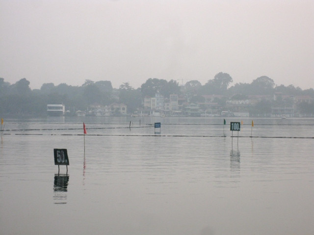 | Để làm sân tập, nhiều bia đích được cắm dày đặc trên mặt hồ... |
