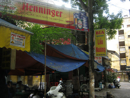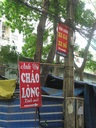 | Nội dung quảng cáo phong phú có đủ loại từ bia hơi, cafe, đến đồ điện tử, sửa chữa xe máy, xe đạp...(ảnh chụp tại khu tập thể Kim Liên) |