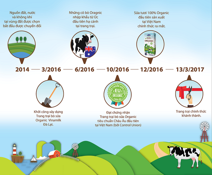 Tháng 3 năm 2016: Trang trại bò sữa Organic Vinamilk Đà Lạt chính thức được khởi công xây dựng. Trang trại áp dụng các công nghệ tiên tiến nhất trong chăn nuôi organic, sử dụng hệ thống xử lý chất thải khép kín, năng lượng tái tạo biogas, năng lượng mặt trời, giảm hiệu ứng nhà kính, thân thiện và bảo vệ môi trường.