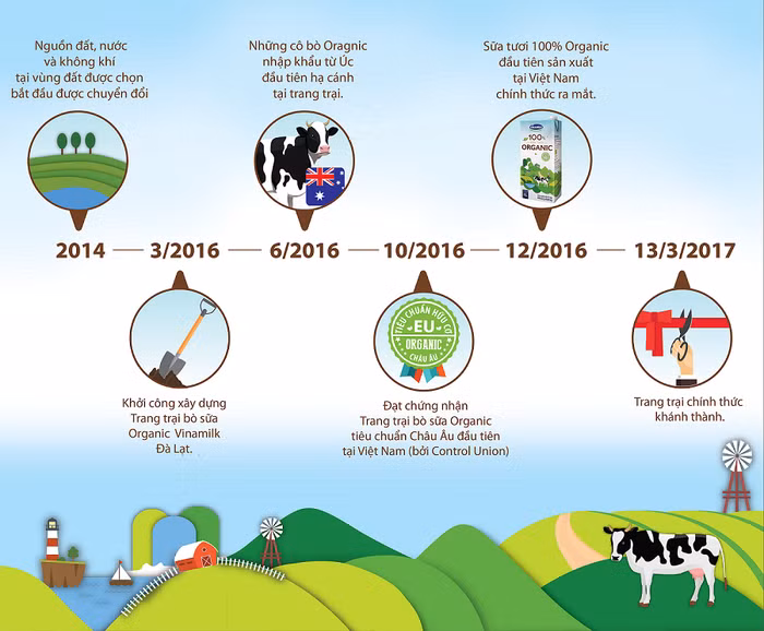 Tháng 6/2016: Những cô bò organic đầu tiên được nhập khẩu về Việt Nam theo đường hàng không. Giống bò được chọn lựa kỹ lưỡng, sức đề kháng cao để thích nghi được với điều kiện chăn thả tự do trên đồng cỏ, đảm bảo không dư lượng kháng sinh trong sữa.