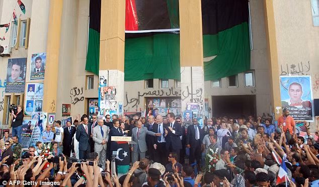 | Trên đường phố Tripoli xuất hiện rất nhiều dòng chữ được viết lên tường bằng sơn theo phong cách graffiti, bày tỏ sự cảm ơn đối với hai vị nguyên thủ, viết bằng tiếng Pháp ("Merci Sarkozy") và Anh ("Thank you Britain"). |