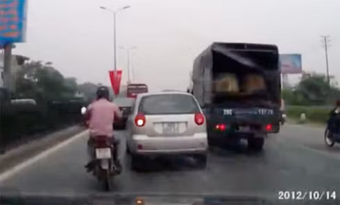 Còn người điều khiển xe máy, dù đã tiến sát xe phía trước nhưng vẫn lao nhanh chỉ đến khi bị ôtô ép sát mới giảm tốc. Với thái độ coi thường mạng sống của chính mình, người này tiếp tục lách qua 2 làn ôtô, vượt nên tạt đầu “trả miếng”. Kien_ktnl bình luận: “Anh ta quá liều mạng. Trong cuộc đối đầu này, tôi thấy xe máy chỉ luôn nhận phần thua thiệt”.