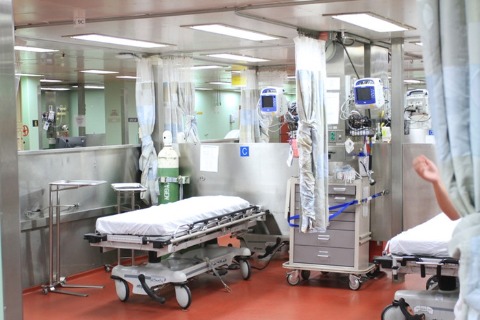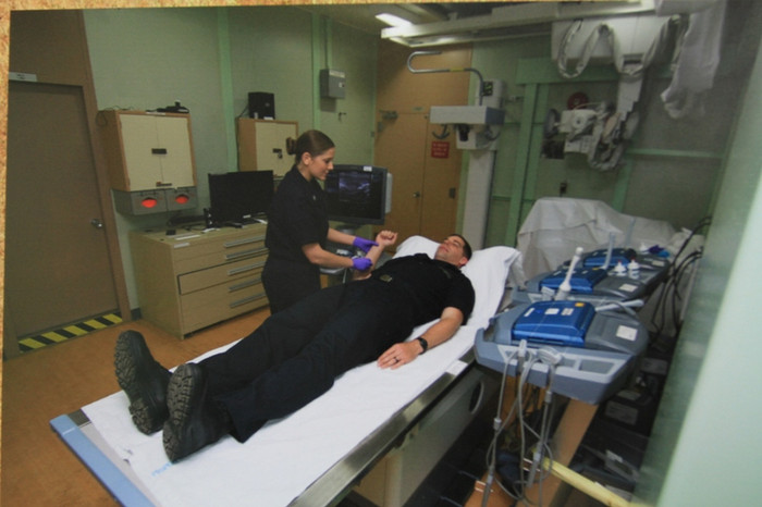 | Giường bệnh ở nơi tiếp nhận bệnh nhân đầu tiên trên tàu. Khi xảy ra sự cố thảm họa, đây là nơi tiếp nhận cùng lúc hàng trăm bệnh nhân, từ đó sẽ chuyển đi các nơi khác để chữa trị. |