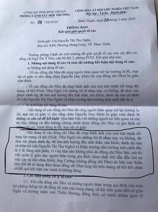 Trong thông báo kết quả giải quyết đơn tố cáo của cô giáo Thu Ngân với chị Ngô Thị Ý Như, Phòng Cảnh sát môi trường, Công an tỉnh Bình Thuận đã có văn bản (do Đại tá Trưởng phòng Tạ Văn Tuấn ký) trả lời như sau: