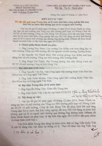 | Biên bản bắt quả tang của đoàn thanh tra về việc Trung tâm Xử lý nước thải của Tập đoàn Dệt May (Vinatex) xả nước thải trực tiếp ra môi trường (Ảnh: Duy Phong) |