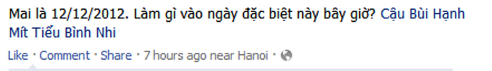 | Một bạn có nickname Milky Way nói: "Phải nhanh nhanh thực hiện những điều đặc biệt vào ngày tam trùng cuối cùng của thế lỷ 21 thôi. Chúng ta khó mà sống được đến thế kỷ 22 nên phải tận dụng cơ hội cuối cùng này". |