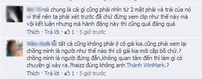 Bạn Mi Lê cũng đồng tình: “Cư xử như vậy với một cô gái là quá tàn nhẫn và dã man. Tại sao không suy xét về phía người đàn ông mà cứ đổ lỗi cho phụ nữ là giật chồng này nọ? Nếu người đàn ông không có thói trăng hoa lăng nhăng thì ai mà dụ dỗ được? Với lại sao không nghĩ người đàn ông đó lừa gạt cô gái này. Rất nhiều lý do mà... Người đàn bà này giận quá hóa điên rồi”.