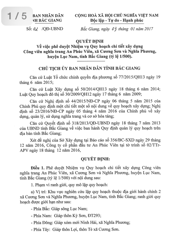 Chỉ vọn vẹn 5 ngày sau, tức ngày 03/1/2017, ông Lại Thanh Sơn, Phó chủ tịch Ủy ban nhân dân tỉnh Bắc Giang ký Quyết định số 02/QĐ-UBND phê duyệt nhiệm vụ quy hoạch chi tiết xây dựng công viên nghĩa trang An Phúc Viên tỷ lệ 1/500.