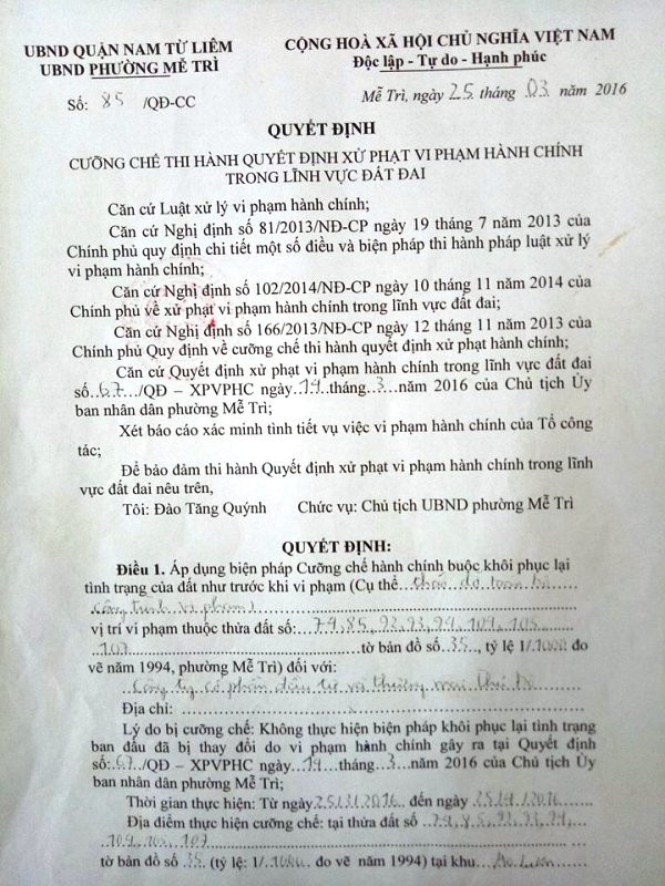 Ngày 25/03/2016, UBND phường Mễ Trì tiếp tục ra Quyết định cưỡng chế số 85/QĐ-CC, áp dụng biện pháp cưỡng chế hành chính buộc khôi phục lại tình trạng đất như trước khi vi phạm.