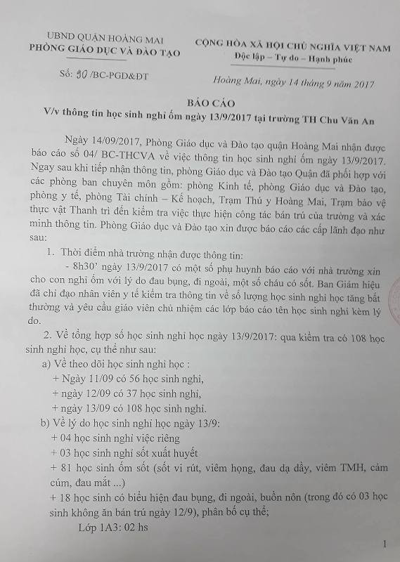 Cụ thể, ngày 14/09/2017, Trường tiểu học Chu Văn An có văn bản số 04/BC-THCVA về việc thông tin học sinh nghỉ ốm ngày 13/09/2017 gửi Uỷ ban nhân dân quận Hoàng Mai, Phòng Giáo dục và Đào tạo quận Hoàng Mai, Uỷ ban nhân dân phường Hoàng Liệt.