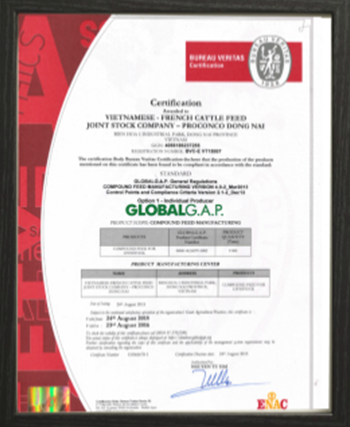 Ngày 24/8/2015, Công ty Cổ phần Việt – Pháp sản xuất Thức ăn gia súc (PROCONCO) đã được cấp chứng nhận Global GAP (Global Good Agricultural Practice) do tổ chức chứng nhận quốc tế Bureau Veritas cấp.