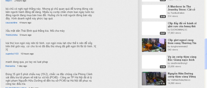 “Qua video thấy bác chủ tiệm vàng là một con người tốt bụng, sống thật thà. Không hiểu hung thủ suy nghĩ gì mà lừa và giết người bằng tuổi bố mẹ mình, lại là phụ nữ, có tuổi, yếu đuối, một mình,…? Người ta cất công làm ăn chân chính đến già mới có cơ ngơi này. Mình là thanh niên, sức dài, vai rộng mà lười nhác, ngu xuẩn đến mức ấy sao?”, nick name timkiemxanh tỏ ra phẫn nộ .