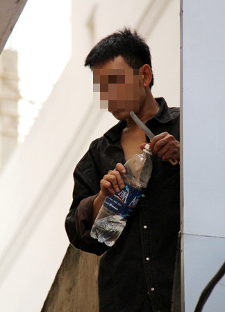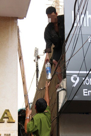 | Hơn 2 giờ trôi qua, mọi biện pháp “giải cứu” thanh niên có ý định tự tử này vẫn chưa đạt được. Trong thời gian này, S. được đưa nước uống và thuốc hút. Dù đã chịu đưa dao cho công an nhưng vẫn không chịu xuống dưới. Không ít lần vị việt kiều Pháp này nhún người định nhảy xuống, hay dùng dao dọa cắt ngón tay khiến những người chứng kiến giật thót mình. |