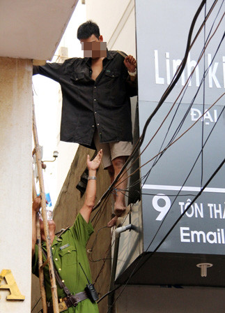 | Chiều 3/6, Nguyễn Thanh S. (28 tuổi, Việt kiều Pháp) đã trèo lên lan can tầng 2 của ngôi nhà đang xây dựng (số 9 Tôn Thất Tùng, phường Phạm Ngũ Lão, quận 1, TP.HCM) đòi nhảy lầu tự tử. |