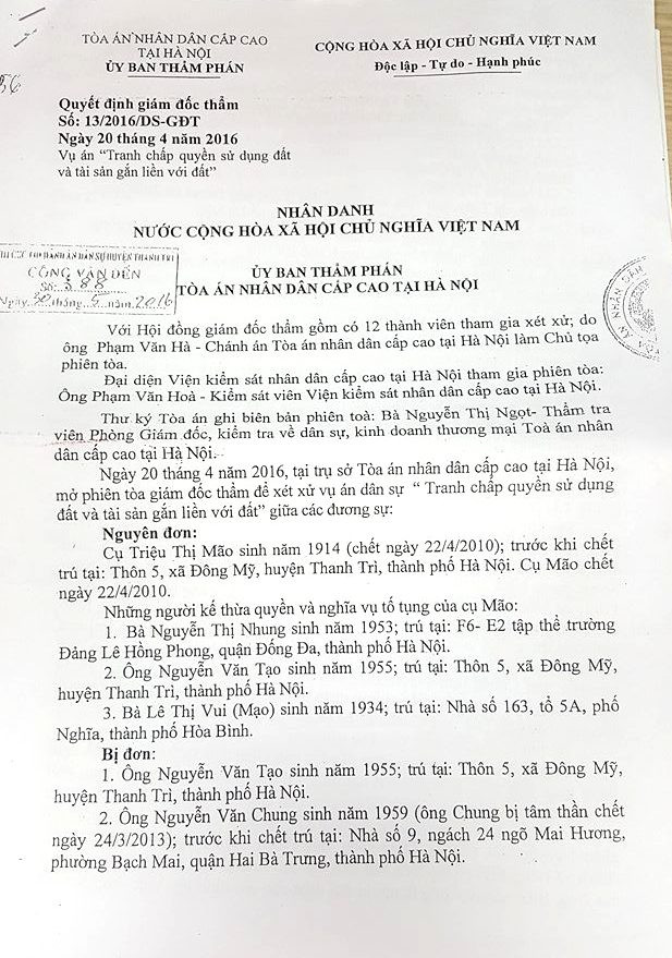 Theo tìm hiểu của phóng viên, đến nay đã 7 tháng kể từ khi Ủy ban Thẩm phán, Tòa án nhân dân cấp cao tại Hà Nội có Quyết định giám đốc thẩm số 13/2016/DS-GĐT diễn ra từ 13 năm nay (năm 2003), với 14 bản án (trong đó, 4 lần kháng nghị, 4 lần giám đốc thẩm, 4 lần phúc thẩm, 2 lần sơ thẩm) xảy ra tại xã Đông Mỹ, huyện Thanh Trì (Hà Nội) nhưng vẫn chưa được cơ quan Thi hành án huyện Thanh Trì thực hiện.