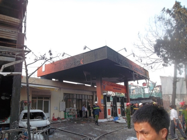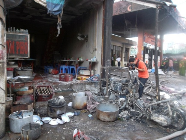 Hai ngôi nhà bên cạnh cây xăng bị cháy bao gồm một quán cơm và một cửa hiệu sửa chữa xe máy (cả hai ngôi nhà này đều cao hai tầng).