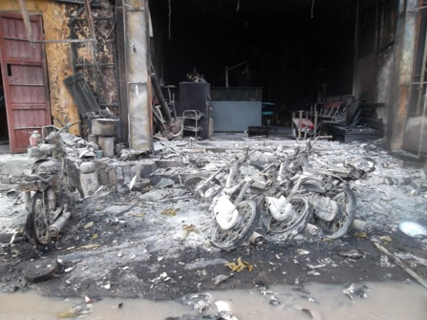 Theo quan sát của phóng viên, toàn bộ hai quán ăn bên cạnh cây xăng đã bị thiêu rụi. 1 chiếc ô tô và nhiều xe máy cũng bị ngọn lửa thiêu rụi chỉ còn trơ khung sắt.