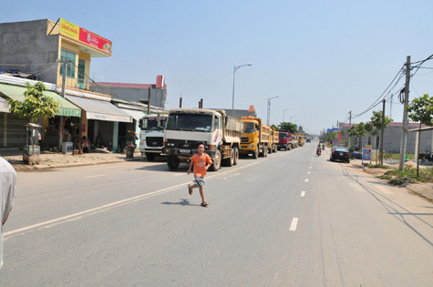 Tại hiện trường vào lúc 9h50’ ngày 13/4, hàng chục xe tải ben chở đất đá phục vụ công trình xây đựng lưu thông trên tuyến DT602, đoạn qua địa phận thôn An Ngãi Tây và An Ngãi Đông (huyện Hòa Vang, TP Đà Nẵng) bị chặn lại hàng loạt.