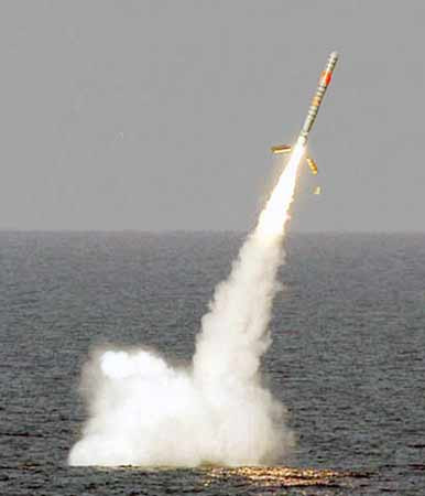 | Tên lửa Tomahawk được phóng từ tàu ngầm ẩn náu dưới mặt biển của Hải quân Mỹ |