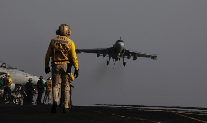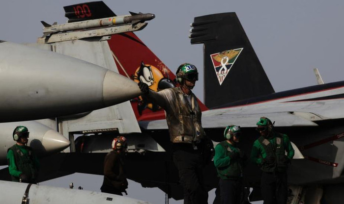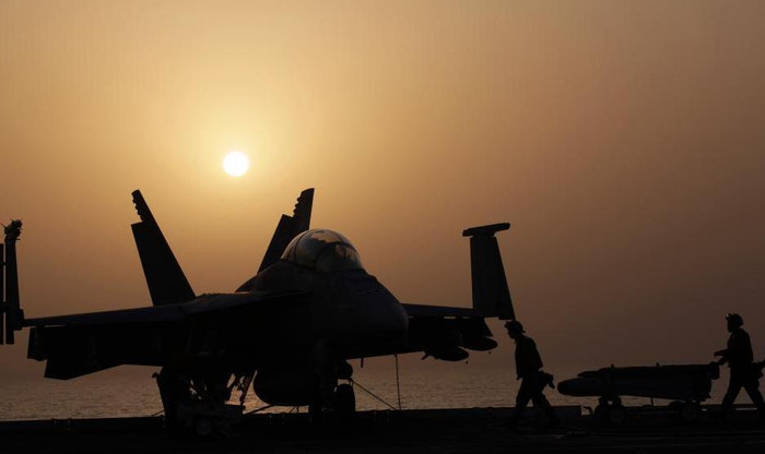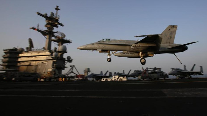 | Ngày 10 tháng 8 năm 2014, máy bay chiến đấu trên tàu sân bay động cơ hạt nhân USS George H.W. Bush ở vịnh Ba Tư triển khai hoạt động không kích đối với Iraq. |