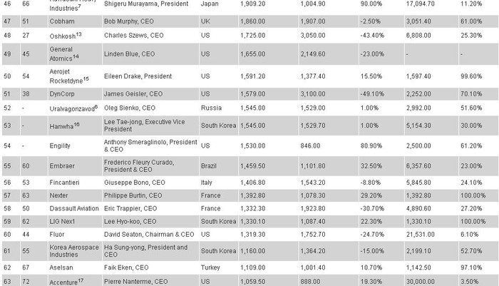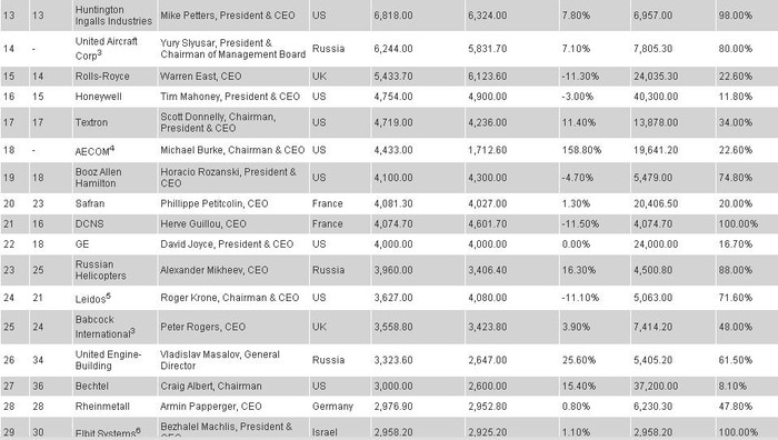Tiếp đó là United Aircraft Corporation với vị trí thứ 14 và Russian Helicopters ở vị trí thứ 23, United Aircraft Corp3 ở vị trí thứ 26 - tăng 8 bậc so với năm ngoái.