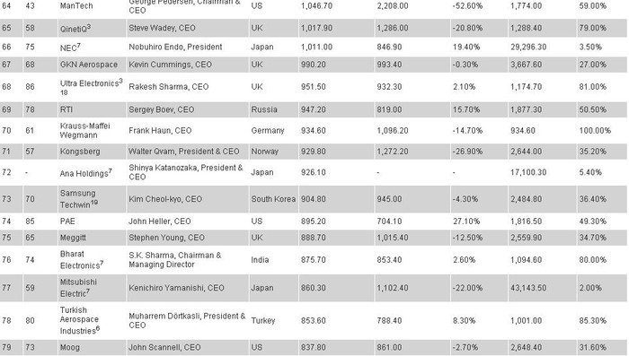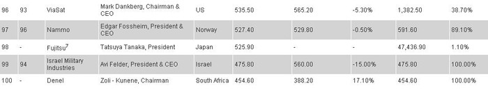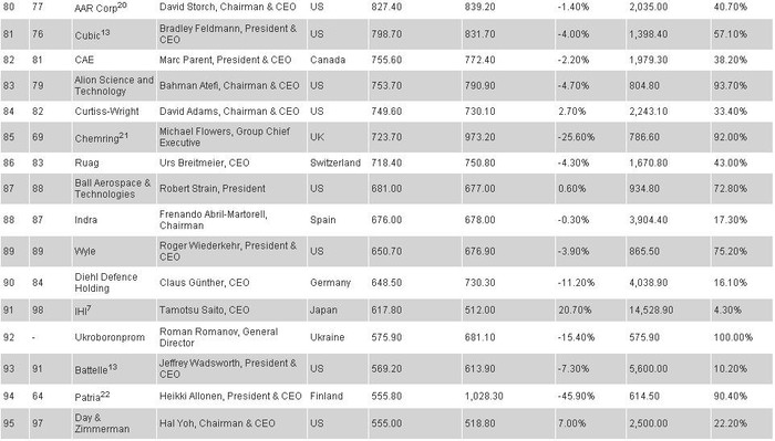 Trang Defense News, một trang chuyên về quốc phòng có uy tín, ngày 28/7 công bố danh sách 100 nhà sản xuất vũ khí hàng đầu thế giới về lĩnh vực này.