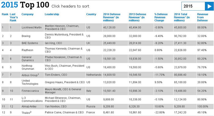 Bảng xếp hạng Top 100 Global Defense Companies được Defense News đưa ra trên cơ sở thống kê so sánh doanh thu của các nhà sản xuất vũ khí hàng đầu thế giới trong năm 2014. Báo cáo này được xuất bản hàng năm kể từ năm 1991.