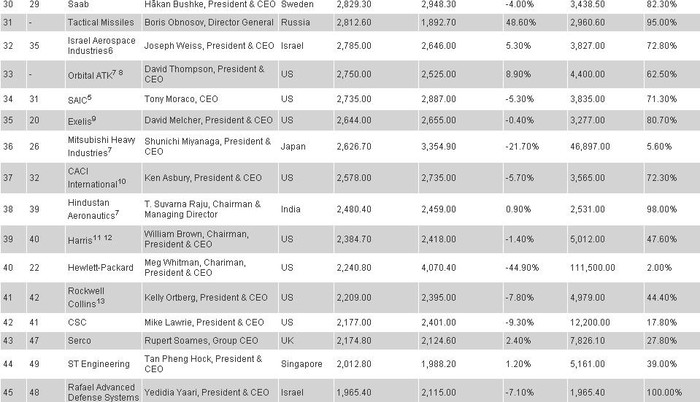 Các nhà sản xuất vũ khí của Mỹ và Anh chiếm giữ phần lớn các vị trí đầu tiên trong bảng xếp hạng Top 10. Ba vị trí đầu tiên trong danh sách này thuộc về các nhà sản xuất vũ khí hàng đầu của Mỹ Lockheed Martin và Boeing, BAE Systems của Anh.