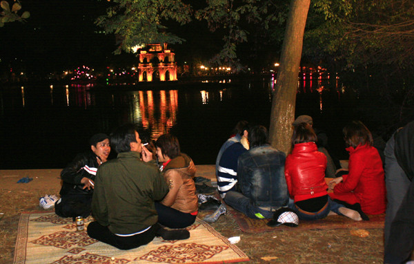 | Nhậu bù khú bên Hồ Gươm trong đêm Noel trên các bãi cỏ được nhiều người ưa thích |
