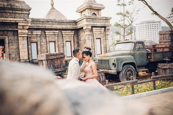 “Tạo hình” độc lạ với chiếc ôtô cũ kỹ nhuốm màu thời gian ở không gian kiến trúc Champa này, Thu Dung, một cô dâu 26 tuổi nói: “Cứ như thể mình được đến Campuchia chụp hình ấy, thích phết”.