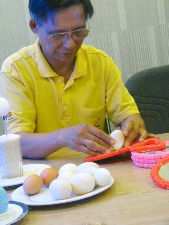 | Để minh chứng cho luận điểm trên, ông Sơn Hà đã thực hành dựng đứng quả trứng trên đầu bút bi... |