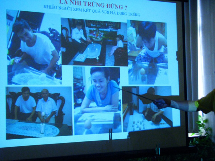 | Tại cuộc khảo nghiệm này, ông Đỗ Sơn Hà khẳng định, trước đây, nhà nghiên cứu Nguyễn Phúc Giác Hải từng “phủ nhận sạch trơn” rằng, hiện tượng quả trứng đứng được trên cây đũa chỉ có người Việt Nam làm được là sai hoàn toàn. |