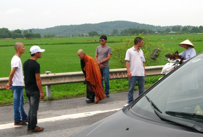 | Khoảng 10h30', Đại đức Thích Tâm Mẫn tạm dừng hành trình. Ngay lập tức, một đệ tử đưa mũ bảo hiểm, chở nhà sư đi. Người dân địa phương truyền tai nhau về ý nghĩa tốt đẹp của hành trình nhất bộ nhát bái. Tuy nhiên, họ cũng bất ngờ và bàn tán xôn xao về những hành động khó hiểu của nhóm người "hộ tống". |