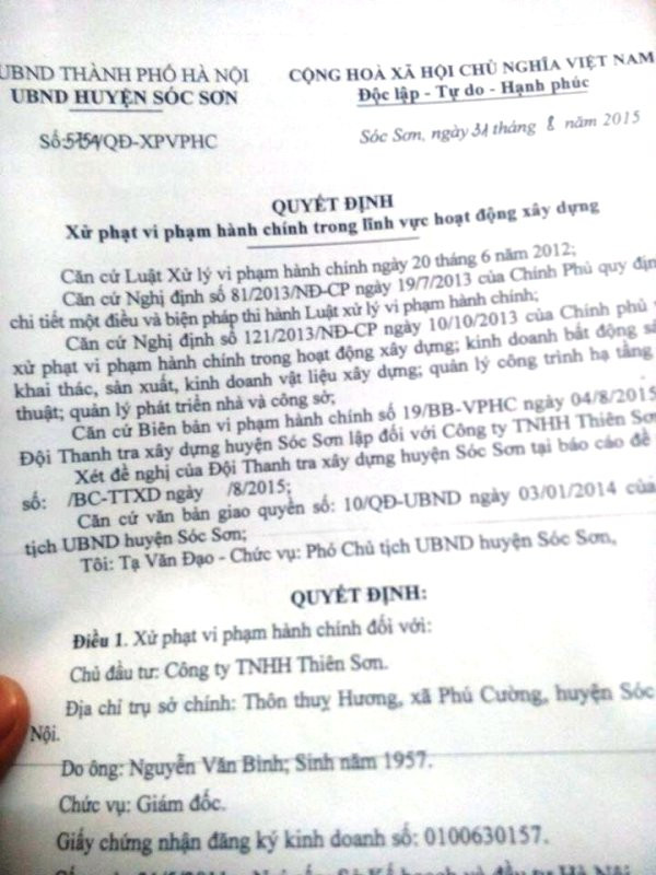 Trước những sai phạm trên, ngày 31/8/2015 UBND huyện Sóc Sơn đã ra Quyết định 5754/QĐ-XPVPHC xử phạt vi phạm hành chính trong lĩnh vực hoạt động xây dựng đối với công ty TNHH Thiên Sơn với số tiền 40 triệu đồng.
