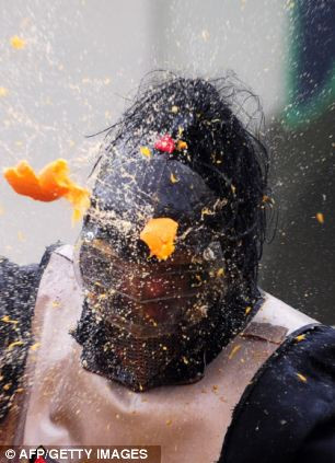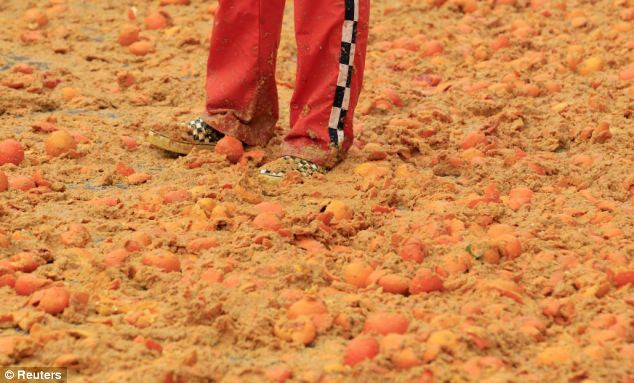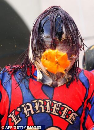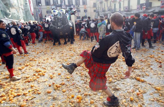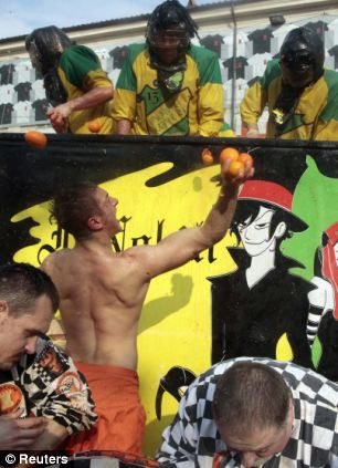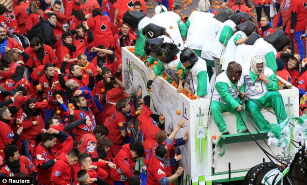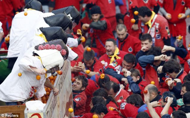 | Tuy nhiên, những trái cam lành vẫn được dùng để ném lại những người trên xe ngựa |