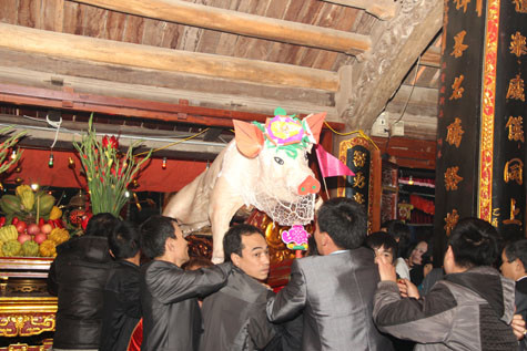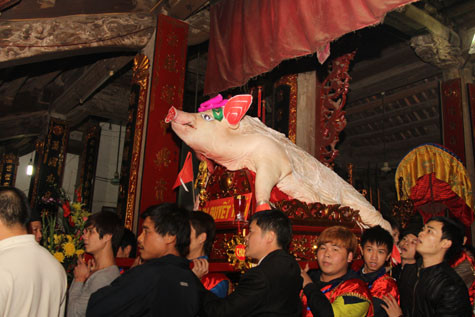 | Đến đúng 21 giờ, 16 "ông Lợn" của các xóm được bắt đầu đưa vào đình làng để chuẩn bị cho lễ tế Thành Hoàng làng diễn ra lúc 12 giờ đêm. |