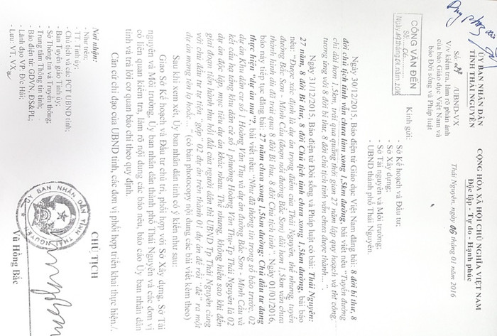 Chủ tịch UBND tỉnh Thái Nguyên Vũ Hồng Bắc có ngay công văn chỉ đạo các cơ quan chức năng kiểm tra, làm rõ nội dung Báo điện tử Giáo dục Việt Nam phản ánh.