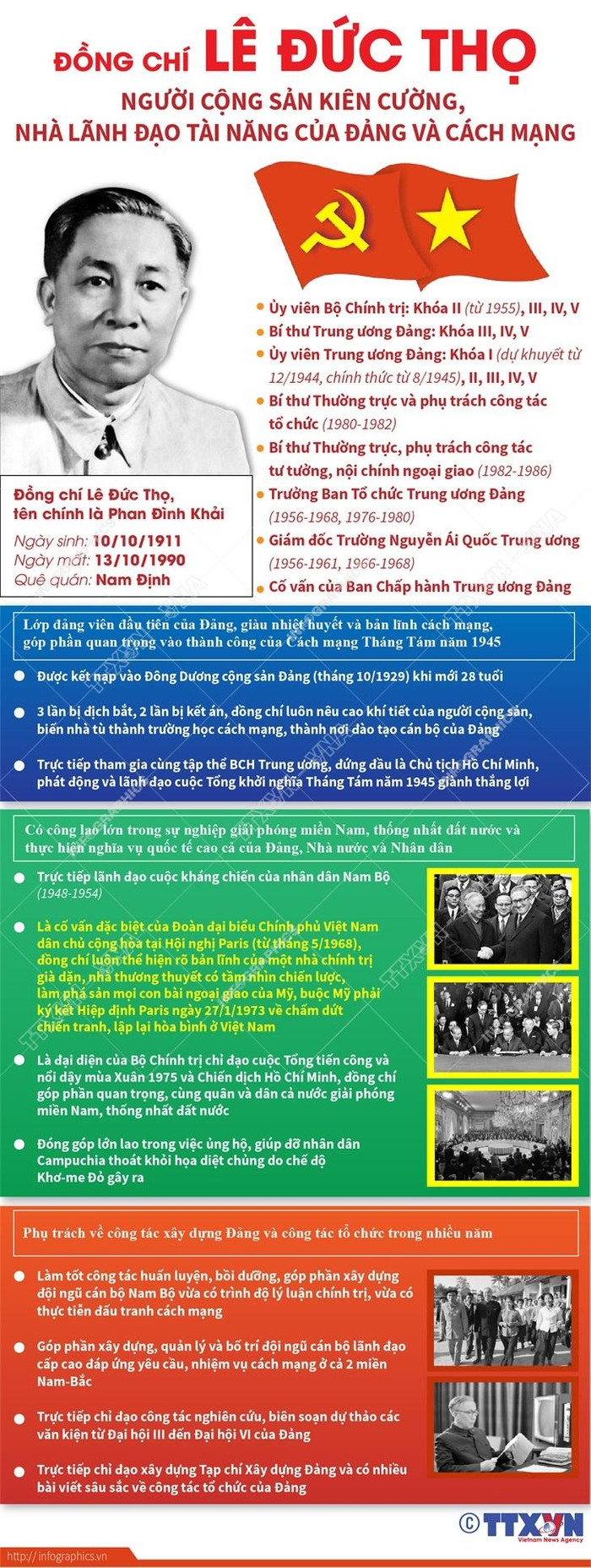 Trong suốt cuộc đời hoạt động cách mạng, đồng chí Lê Đức Thọ đã đem hết tâm sức, tài năng và trí tuệ của mình cống hiến cho sự nghiệp cách mạng vẻ vang của Đảng và của dân tộc.