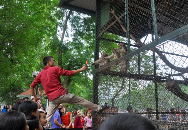 | Tuy nhiên, nhiều hành động xấu của du khách đang khiến cho Sở thú xấu xí và ảnh hưởng tới những con thú ở đây. (Trong ảnh là một người đàn ông đang đưa điếu thuốc cho khỉ hút). |