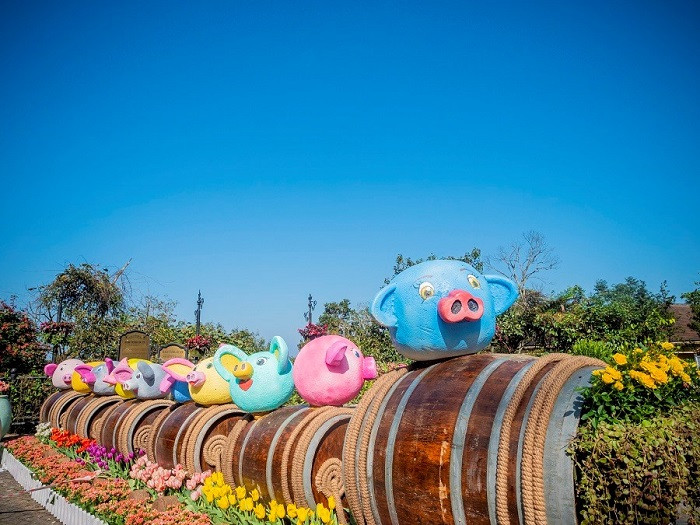 Những chú heo con xuất hiện ở khắp mọi nơi, như một người bạn mới gần gũi và thân thiện của khu du lịch, rạng rỡ chào đón tất cả du khách đến vui chơi và thưởng ngoạn.