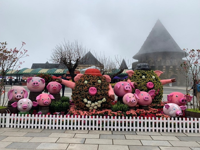 Giữa quảng trường Du Dôme là đại gia đình heo hồng xinh xắn với heo bố mẹ và đàn con cùng đủ sắc thái biểu cảm trên khuôn mặt tại tiểu cảnh Sum vầy.
