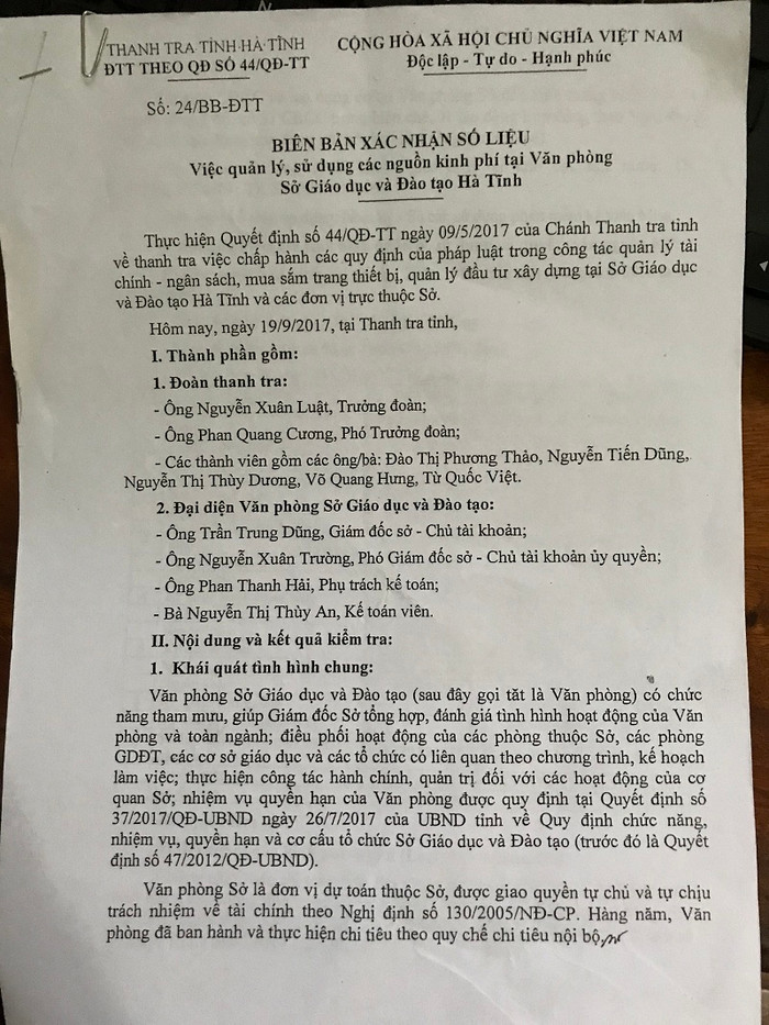 Cụ thể, tại Biên bản xác nhận số liệu số 24/BB-ĐTT về: “Việc quản lý, sử dụng các nguồn kinh phí tại Văn phòng Sở Giáo dục và Đào tạo Hà Tĩnh” được lập ngày 19/9/2017 tại Thanh tra tỉnh giữa Đoàn thanh tra gồm ông Nguyễn Xuân Luật - Trưởng đoàn, ông Phan Quang Cương - Phó Trưởng đoàn và các thành viên: