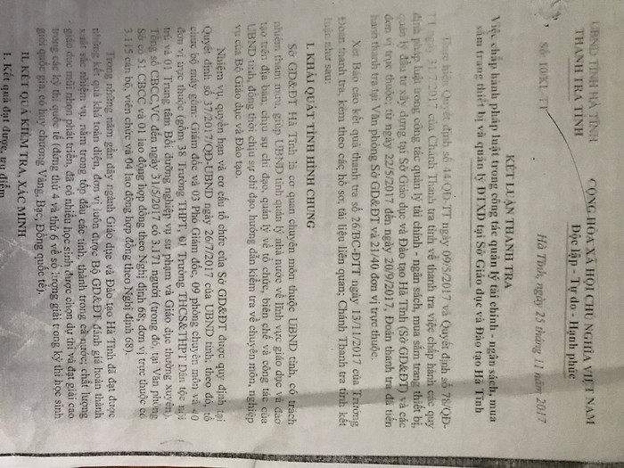 Ngay cả Kết luận thanh tra số 10/KT-TT ngày 25 tháng 11 năm 2017 của Chánh Thanh tra tỉnh Hà Tĩnh “Về việc chấp hành pháp luật trong công tác quản lý tài chính- ngân sách, mua sắm trang thiết bị và quản lý đầu tư xây dựng tại Sở Giáo dục và Đào tạo Hà Tĩnh” vẫn không được công bố công khai để cán bộ, giáo viên, nhân viên được biết, được bàn và kiểm tra.