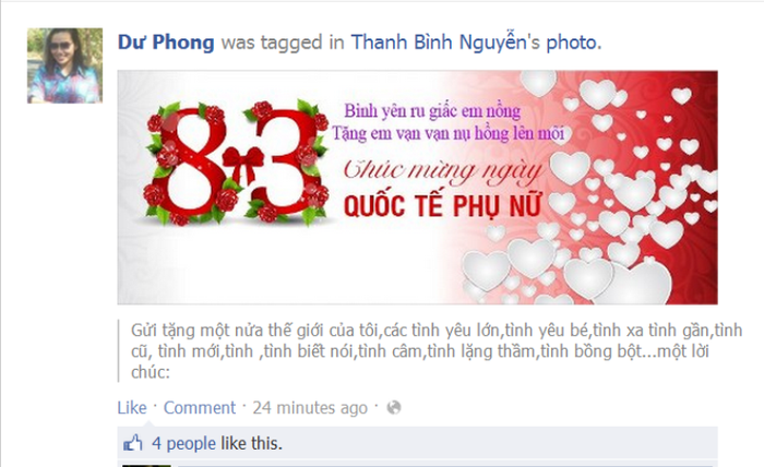6. 8/3 mình chúc tất cả các bạn một ngày vui vẻ, ý nghĩa, hạnh phúc nhé. Chúc các bạn ngày càng xinh đẹp hơn, có nhiều người yêu thương hơn, ai củng có được người yêu tốt.
