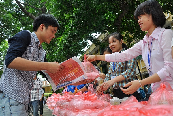 | 450 suất cơm mặn miễn phí của quỹ Khuyến học Đức tài cũng được các bạn SVTN trao tới sĩ tử |
